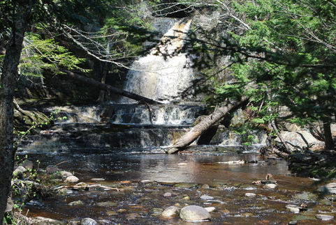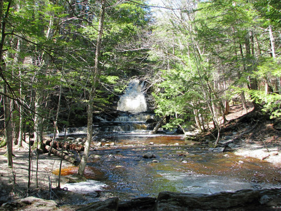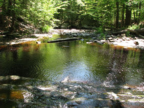 The trail then curves away from the falls and you'll see the old slate quarry on your right, beyond the fence. The trail continues, passing over the remnants of the old dam that once created the trout pond.