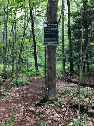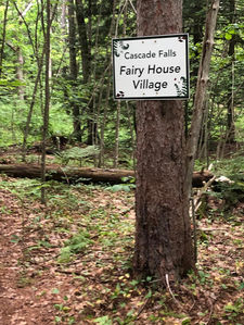 Departing from the Trout Pond Loop: Marked by yellow blazes, the Brookside Trail descends towards the edge of Cascade Brook. This trail navigates over some roots and uneven terrain as it follows the edge of Cascade Brook. After about 400 feet (0.07 miles), a short spur trail from the right leads to the entrance of the fairy house village. The Brookside Trail continues straight, then turns right to follow the brook again until it meets the Falls View Trail just before the bridge.