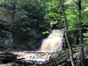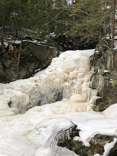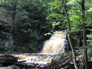 The ledge trail blazed in green, proceeds down the south side of the falls to the lower falls viewing. Starting from the kiosk, follow the Trout Pond Loop right until you reach a large clearing where the Trout Pond Loop turns left. The Ledge Trail continues straight ahead, followed by a sharp right turn at the far end of the clearing. From this turn, you'll see the fencing along the south side of the Upper Falls viewing area. This area is surrounded by safety fencing for your protection. Please enjoy the view from a safe distance and do not climb or bypass the fences.