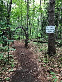 Continuing on the Trout Pond Loop, the trail slopes slightly downhill. Off to your left, you'll see the start of the fairy house village. To find the entrance to the village look for the distinctive waddle arch ( at 0.14 miles) along with signs and rules for building your own fairy house. A short spur trail leads through the arch and connects to the Brookside Trail.